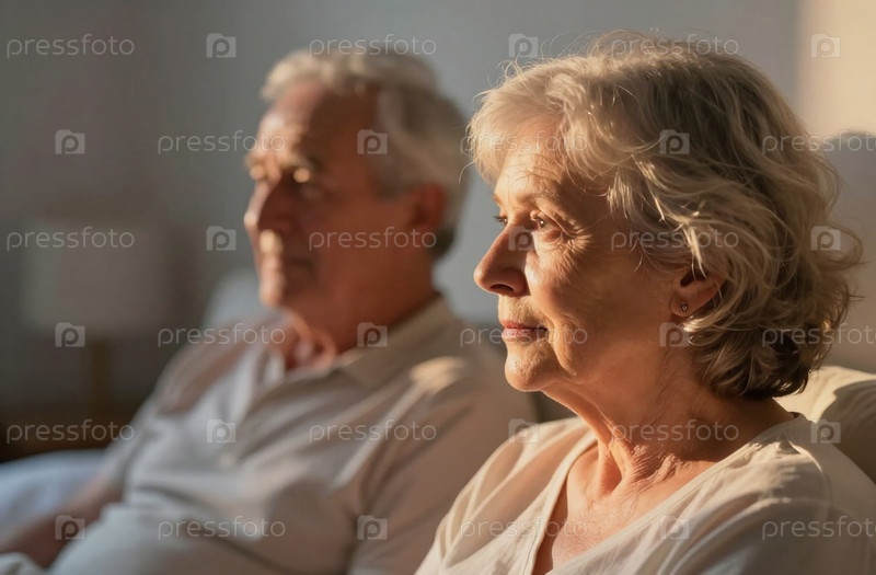 Пожилая пара сидит вместе в своей светлой спальне.Солнце светит, бросая на них теплый свет, когда они делятся тихим моментом Generative AI