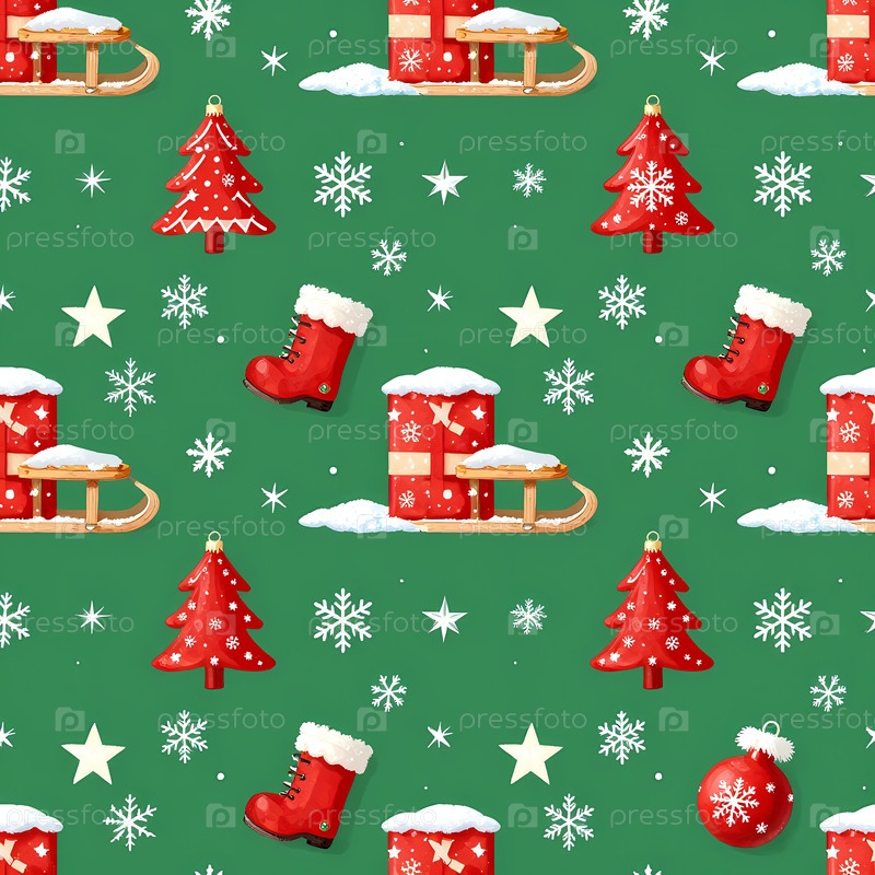 Дизайн отличается узором упаковочной бумаги с красными сапогами, деревьями, подарками, снежинками и звездами на зеленом фоне, подходящим для празднования зимы Generative AI