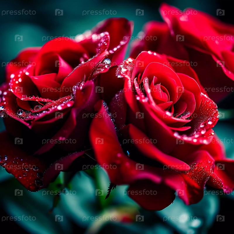 Три красных розы с капельками воды отдыхают на зеленых листьях. Они стоят в саду, где мягкий утренний свет подчеркивает их листочки. Цветы выглядят свежими и яркими Generative AI