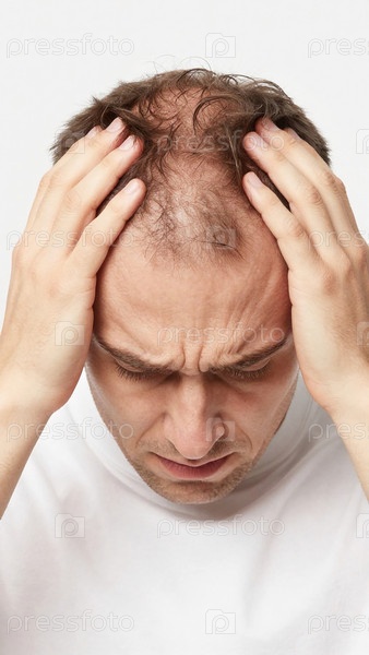 Человек испытывает стресс из-за выпадения волос. Он держит голову в руках и смотрит вниз. Фон ясен и не отвлекает внимания на озабоченность субъекта Генеративный ИИ