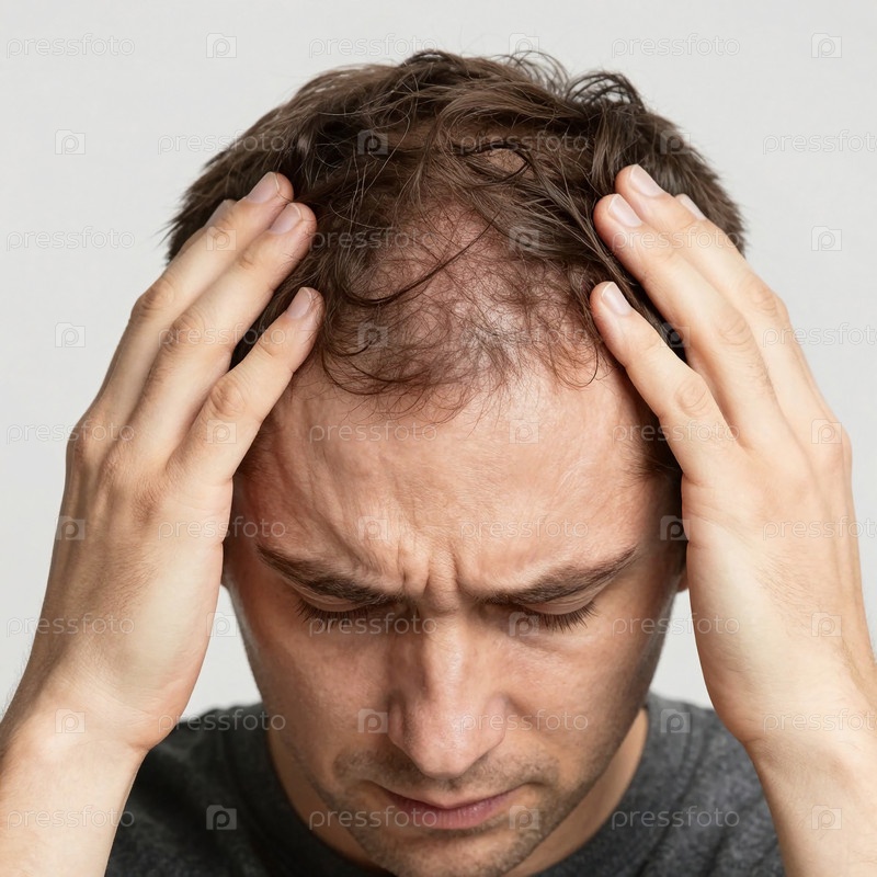 Мужчина стоит в комнате с нейтральным фоном. Он прикасается к голове обеими руками, выражая обеспокоенность по поводу выпадения волос. Этот момент отражает его борьбу с истончением волос Generative AI