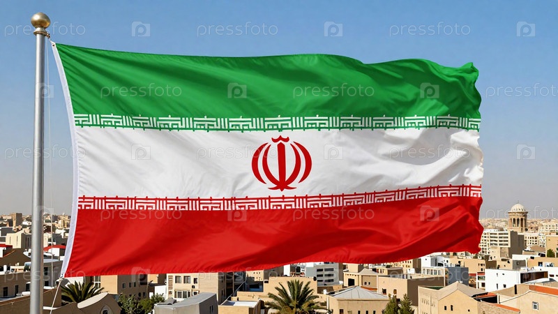 Иранский флаг высоко развевается на мачте над городским пейзажем.Здания видны ниже вместе с пальмами и ясным небом.Сцена показывает типичный солнечный день Generative AI