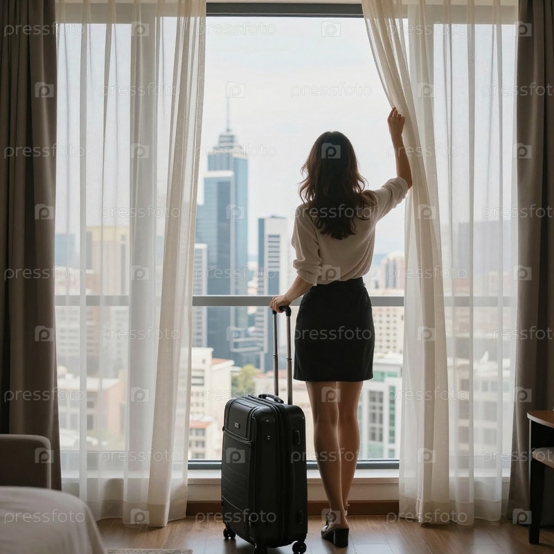 Женщина стоит у окна гостиничного номера. она держит чемодан и смотрит на небоскребы в городе. шторы слегка затянуты назад генеративный AI