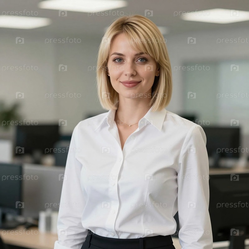 Женщина с светлыми волосами стоит в офисе банка. Она носит белую рубашку и выглядит готовой к работе. На заднем плане видны многочисленные компьютеры, показывающие оживленное рабочее место Generative AI