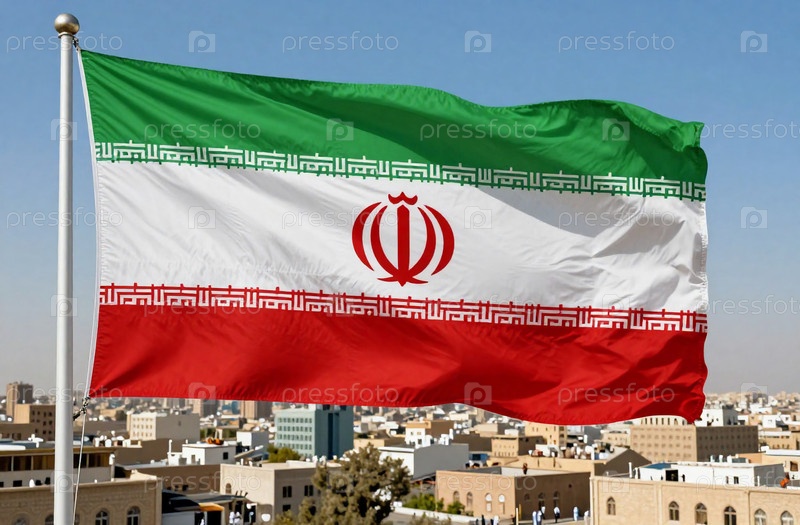 Виден иранский флаг, развевающийся на ясном голубом небе, демонстрируя свои цвета заметно над городом, заполненным зданиями и сооружениями Generative AI
