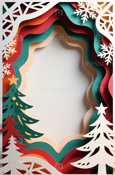 Дизайн фона для новогодних и рождественских открыток показывает цветные вырезы из бумаги в слоях.Дизайн включает деревья и праздничные элементы.Центр остается пустым для настройки Генеративный ИИ