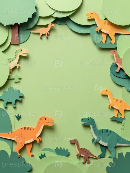 Группа фигур динозавров стоит среди зеленых деревьев и растений, сделанных из бумаги.Эта сцена показывает различные типы динозавров в игривой обстановке днем Генеративный ИИ