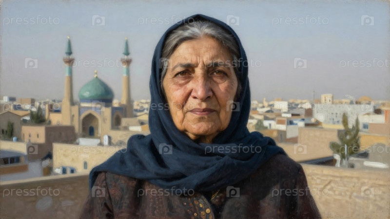 Пожилая женщина стоит на фоне города в Иране. Ее выражение говорит о мудрости и силе. Настройка отражает ее жизнь в местном районе и его архитектуру Generative AI