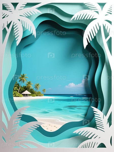 Сцена на пляже показывает голубые волны океана и пальмы вдоль берега. Небо чисто, за исключением нескольких облаков. Этот фон открытки фиксирует тропическую обстановку Generative AI