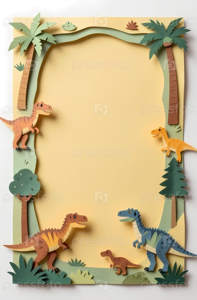 Динозавры расположены вокруг пустого пространства в красочном дизайне с деревьями и растениями.Эта установка отлично подходит для художественных проектов или учебных материалов для детей Генеративный ИИ