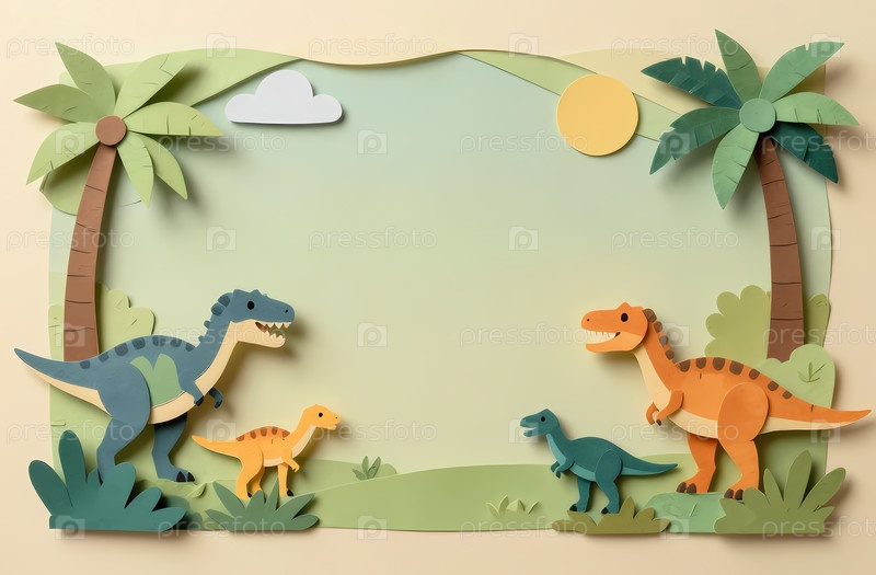 Динозавры разных размеров стоят на игривой сцене, выполненной из вырезов бумаги. пальмы и солнце дополняют фон ярким и забавным стилем Generative AI