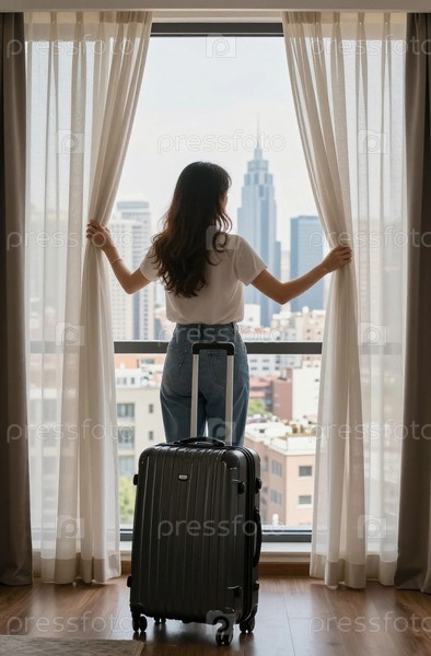 Женщина стоит у окна гостиничного номера. Она затягивает шторы, чтобы увидеть высокие здания снаружи. Рядом с ней на полу лежит чемодан Генеративный ИИ