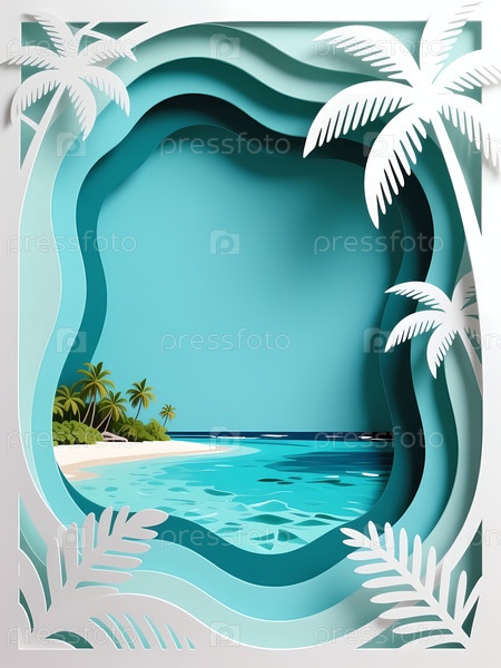 Яркая пляжная сцена показывает чистую воду, волны и пальмы в веселом макете открытки.Этот дизайн отражает атмосферу отпусков с тропическими элементами Generative AI