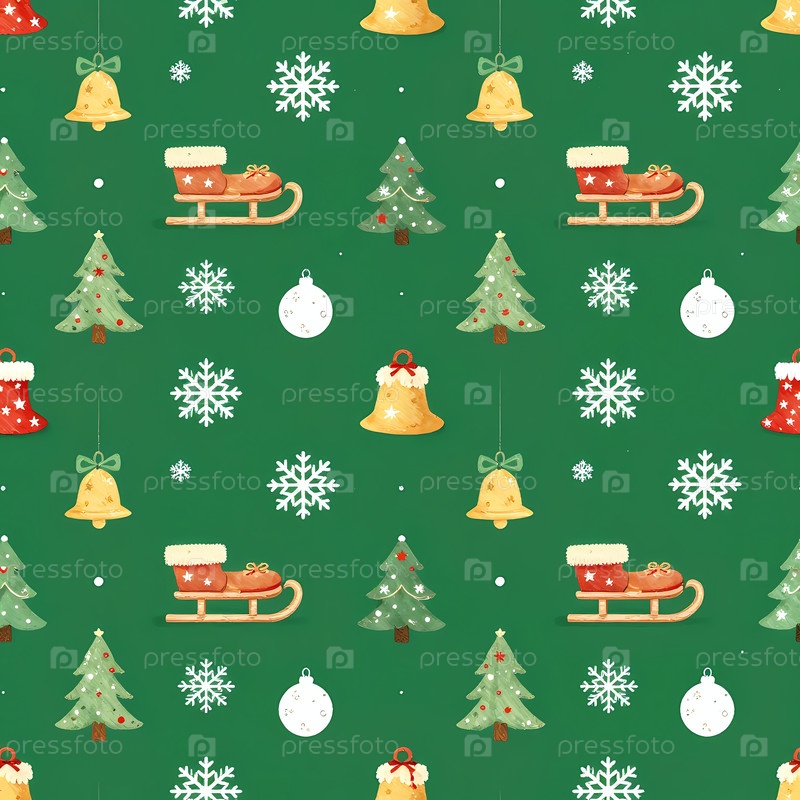 Праздничные элементы, такие как рождественские елки, колокола и снежинки на зеленом.Идеально подходит для упаковки подарков во время Нового года и Рождества генеративный AI