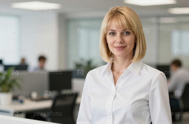 Женщина с светлыми волосами находится в офисе банка. Она одета в белую рубашку и смотрит в камеру, а коллеги работают за своими столами на заднем плане. Это обычный рабочий день Генеративный ИИ