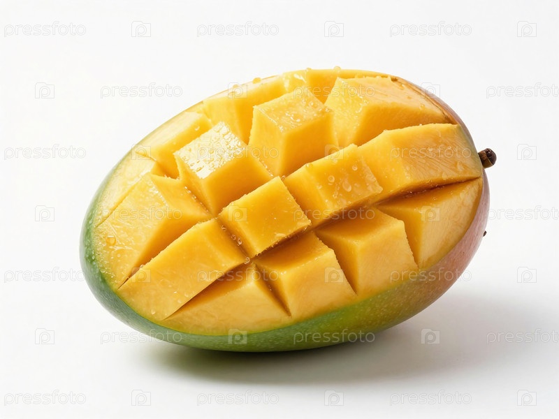 Обрезанный манго сидит на плоской поверхности. Плод показывает ярко-желтую кожуру с геометрическими узорами. Капли воды намекают на свежести, делая фрукты выглядеть аппетитными Generative AI