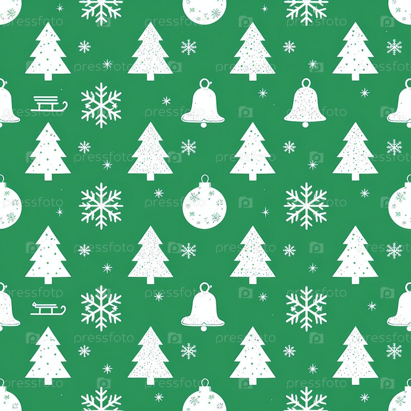 Бесшовный рисунок для упаковочной бумаги. Он включает в себя деревья, колокола, снежинки и орнаменты. Фон зеленый, а все элементы белые, идеально подходят для праздничных случаев Generative AI