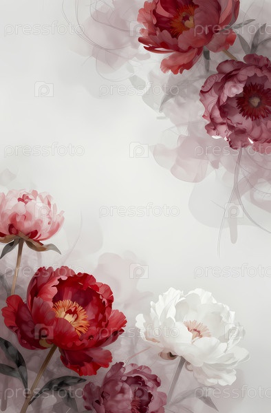 В саду расположены вместе пионы в красных, бордовых и белых оттенках.Цветы показывают нежные листочки и пышные зеленые листья в солнечный весенний день Generative AI