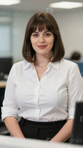 Женщина с коричневыми волосами носит белую рубашку в офисе банка. она улыбается и стоит перед столом. настройка показывает профессиональную рабочую среду генеративный ИИ