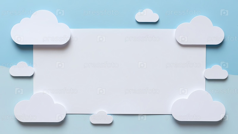 В центре на светло-синем фоне расположен пустой прямоугольник, окруженный несколькими белыми облаками разных размеров, создающими пространство для письма или дизайна