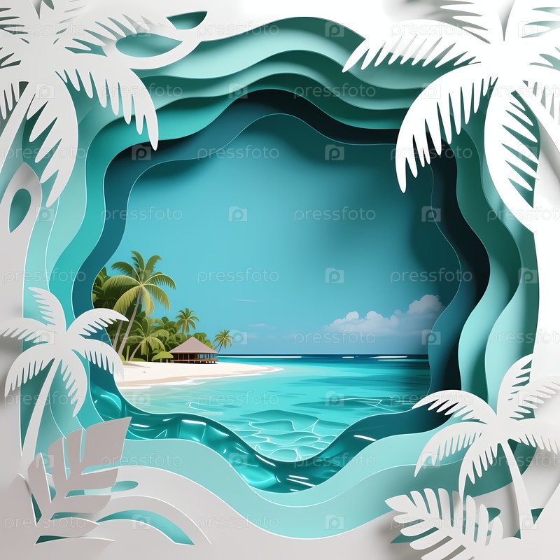 Сцена на пляже показывает нежные океанские волны, пальму возле берега и хижину в отдалении.Небо синее с несколькими облаками.Этот вид приглашает к релаксации и наслаждению Генеративный ИИ