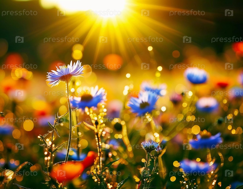 В солнечном лугу растут дикие цветы и тянутся к яркому солнечному свету.Светлые лучи сияют вниз, создавая теплую и приглашающую сцену, наполненную цветами и жизнью Генеративный ИИ