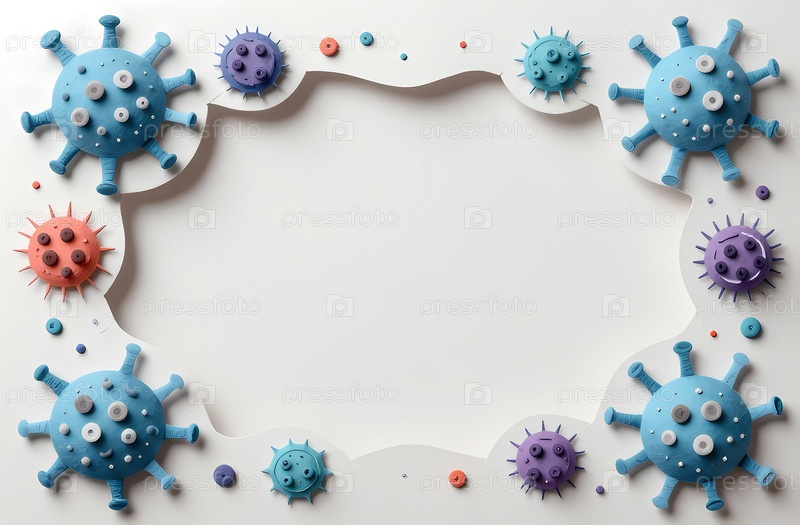 Красочные пластилинные модели вирусов и микробов окружают пустое пространство.Формы бациллы и коронавируса создают увлекательный дизайн на белой поверхности Generative AI
