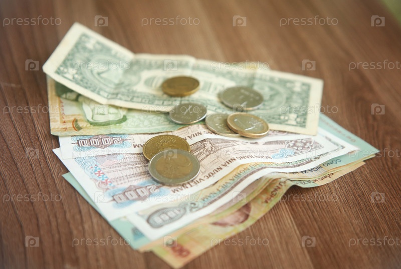 Деньги купюры и монеты рубли, евро и разных других стран на столе, крупный план