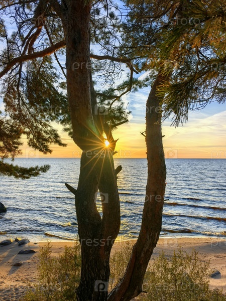 Солнце пробивается сквозь сосны на побережье Чудского озера