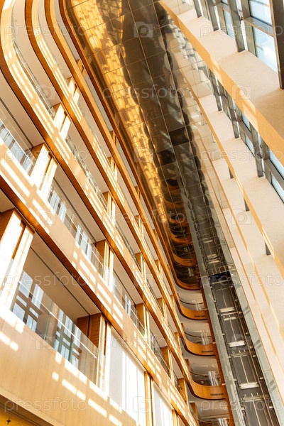 Современный многоэтажный атриум с изогнутыми деревянными балконами, стеклянными перилами, отражающими потолочными панелями и лифтами, освещенными естественным солнечным светом, идущим через окна