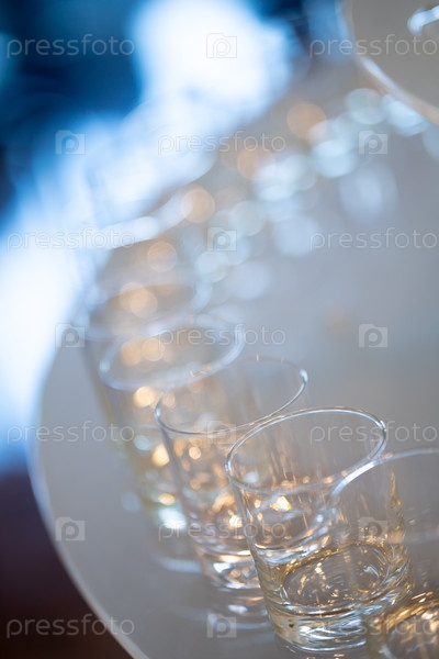 Ряд пустых прозрачных стаканов на белой поверхности с мягким фоном боке, подготовленных для празднования или catering-события