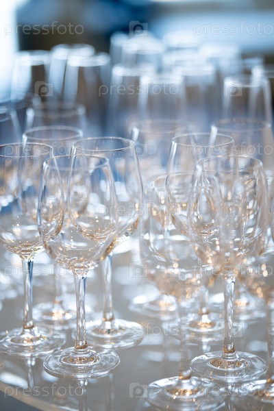 Близкий план пустых кристаллических бокалов вина, расположенных на отражающей поверхности с мягким фоном боке, готовых к элегантному мероприятию или приему
