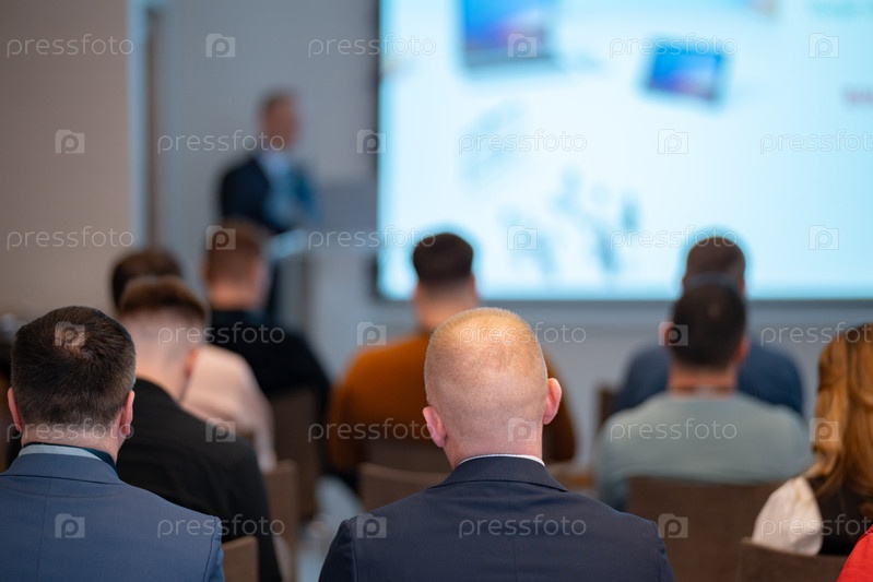 Размытое изображение бизнес-спикера, выступающего перед аудиторией