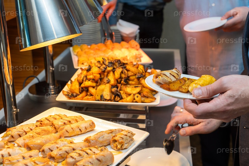 Бизнесмен в костюме подает жареную куриную булочку и жареные картофели на гостиничном буфете во время обеда корпоративной конференции