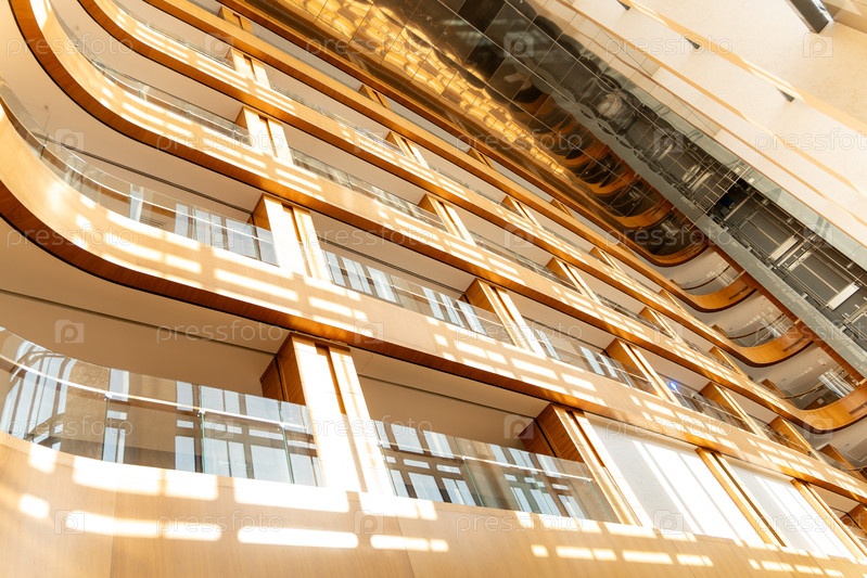 Низкоугольный снимок современного атриума с изогнутыми деревянными балконами и стеклянным потолком.Солнечный свет фильтрует сквозь крыльцо, подчеркивая архитектурные линии интерьера этого роскошного отеля
