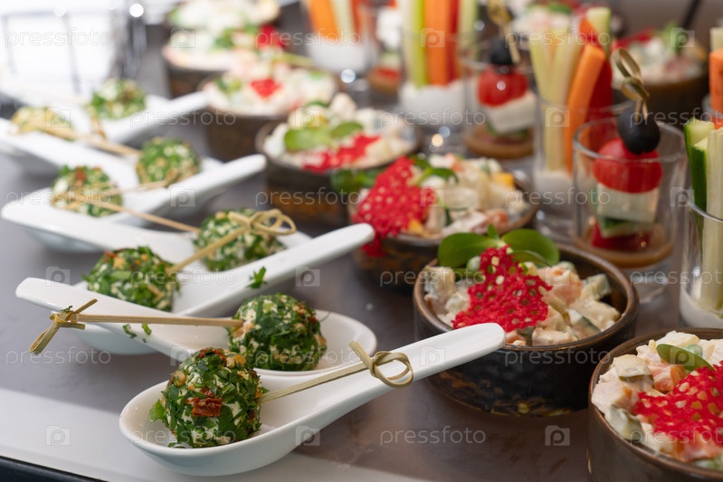 Гурманское питание закуски с травяными сыровыми шариками на ложках и русские салатные миски в банкетном буфете