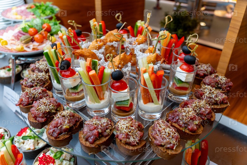 Элегантный кейтеринговый буфет с говяжьими каналами, овощными палочками в бокалах и гурманскими закусками для корпоративного мероприятия