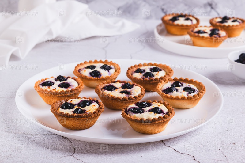 Выпеченные мини-тартлеты с коттеджным сыром и черной смородиной на тарелке на столе