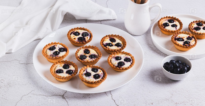 Выпеченные мини-тартлеты с коттеджным сыром и черной смородиной на тарелке за столом