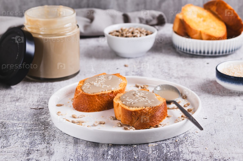 Урбеч из семян кунжута и подсолнечника на хлебе в тарелке