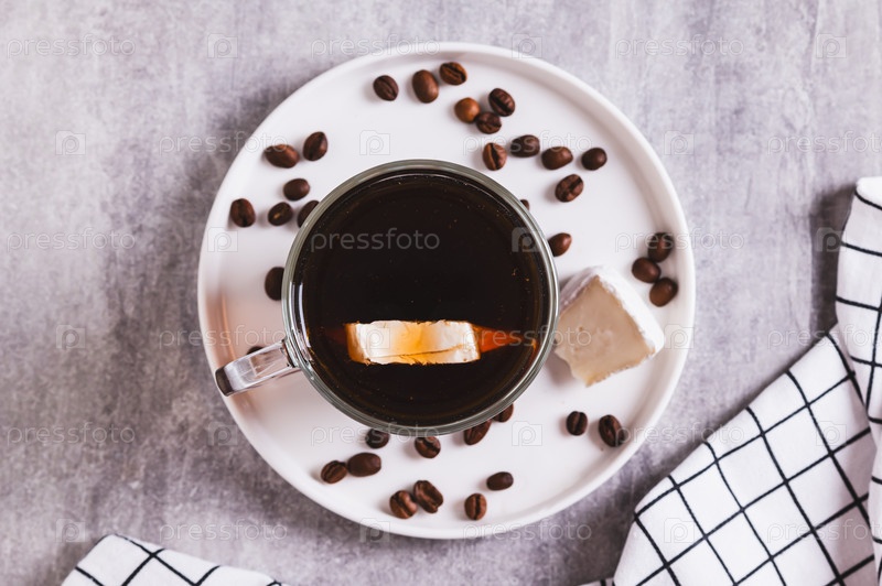 Близкий снимок черного кофе с куском сыра бри в стакане на столе