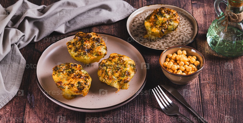 Половины картофеля выпечены с сыром, чесноком и травами на тарелке на столе веб-баннер
