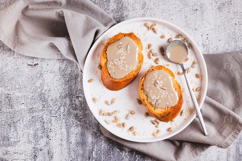 Близкий снимок урбека, сделанного из семян кунжута и подсолнечника на хлебе на тарелке