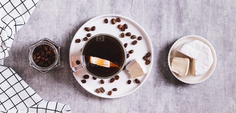 Кофе с эспрессо-бри в чашке и сыр в миске на столе top view web banner