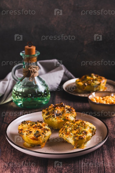 Половины картофеля выпечены с сыром, чесноком и травами на тарелке на столе вертикальный вид