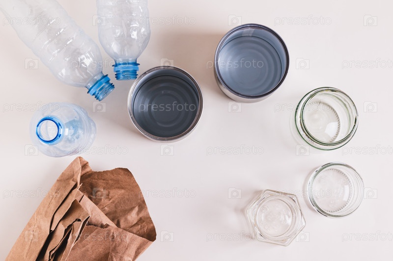 Близкий снимок бумаги, стекла, металла и пластика для раздельного сбора отходов на столе