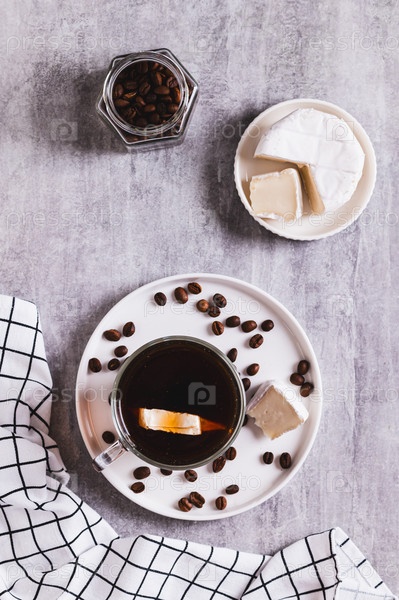 Кофе с эспрессо-бри в чашке и сыр в миске на верхнем столе и вертикальный вид