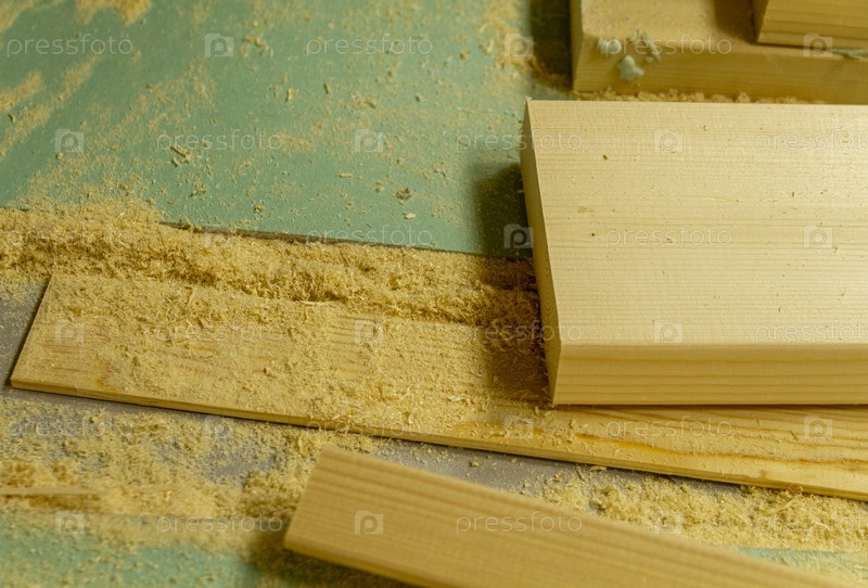 Изображение показывает сцену деревообрабатывающей мастерской с кусками сырой древесины, разбросанными по рабочему столу, покрытому пиломатериалом, демонстрируя процесс строительства мортизы и стенового соединения