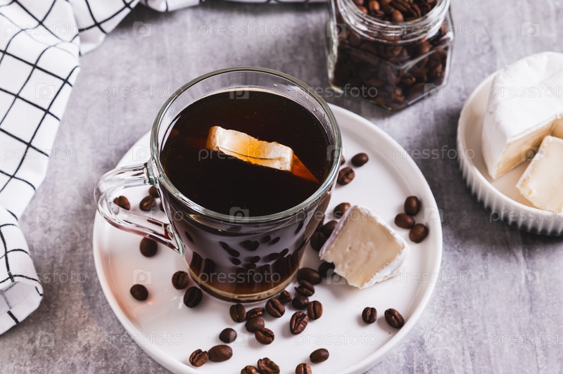 Кофе с эспрессо-бри в чашке и сыр в миске на столе