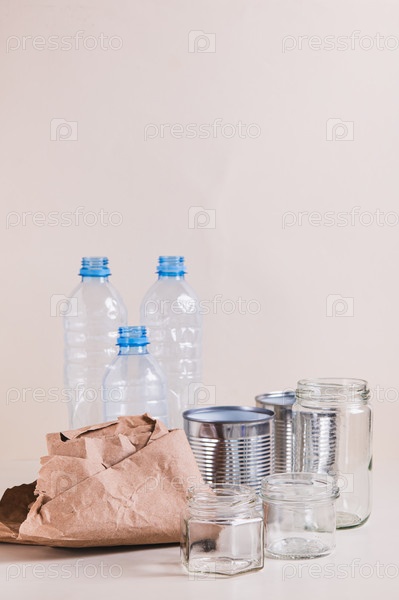 Бумага, стекло, металл и пластик для раздельного сбора отходов на столе вертикальный вид